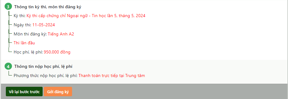 Sau khi kiểm tra thông tin đăng ký dự thi, học viên có thể gởi đăng ký đến trung tâm bằng cách nhấn nút “Gởi đăng ký”, hoặc nhấn nút “Về lại bước trước” để chỉnh sửa thông tin đăng ký, sau đó mới gởi đăng ký đến trung tâm.