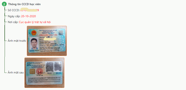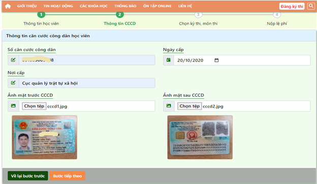 Bước 3: Nhập thông tin CCCD học viên, sau đó nhấn nút Bước tiếp theo, hoặc nhấn nút Về lại bước trước để kiểm tra thông tin