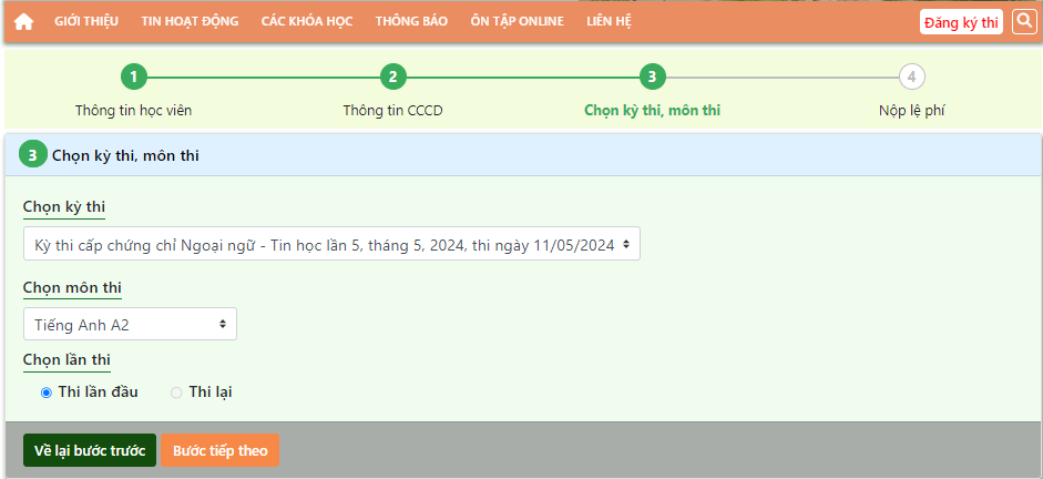Ở bước này, học viên cần chọn kỳ thi, môn thi, lần thi.