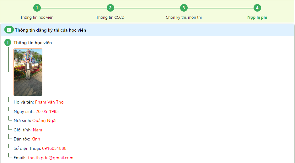 Bước 6: Xem lại thông tin đã đăng ký: học viên có thể xem lại thông tin đã đăng ký dự thi, và có thể kiểm tra, hoặc chỉnh sửa lại trước khi gởi đăng ký đến trung tâm.