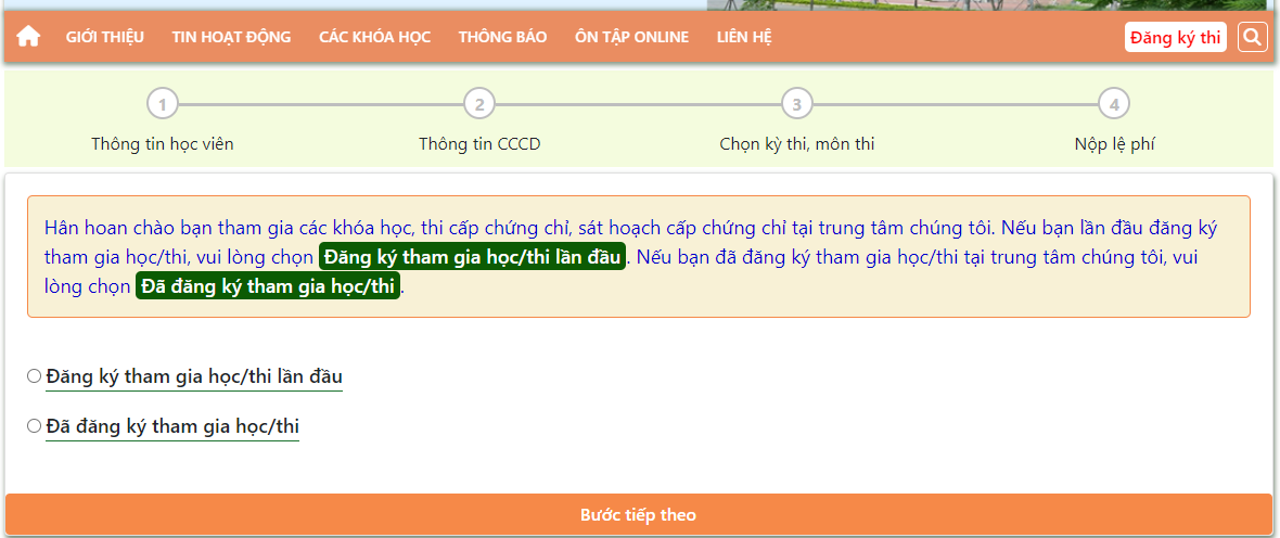 - Tùy chọn “Đăng ký tham gia học/thi lần đầu” dành cho học viên chưa tham gia khóa học/thi nào tại Trung tâm.