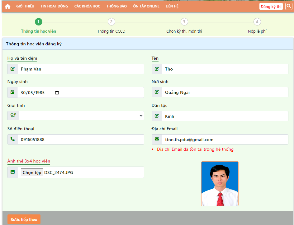 Bước 2: Nhập thông tin học viên đăng ký