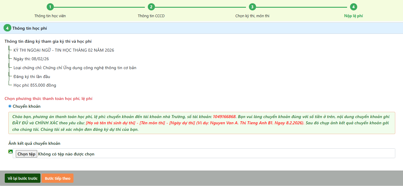 Thí sinh sau khi chuyển khoản cần cung cấp thông tin minh chứng đã chuyển khoản đến tài khoản Nhà trường bằng cách đính kèm ảnh chuyển khoản.